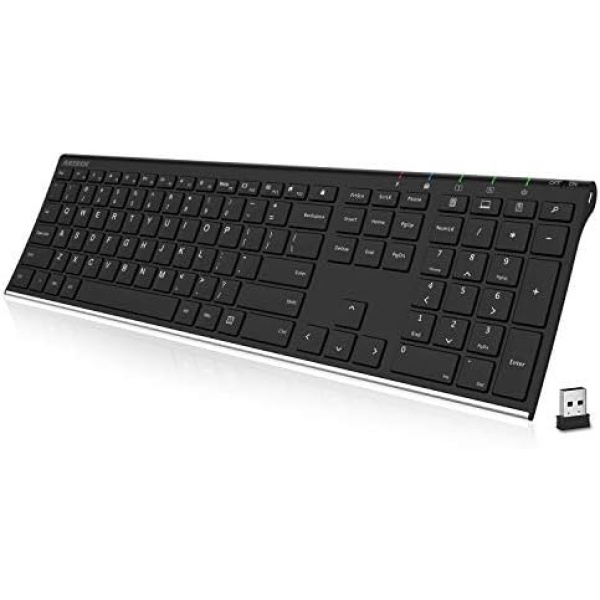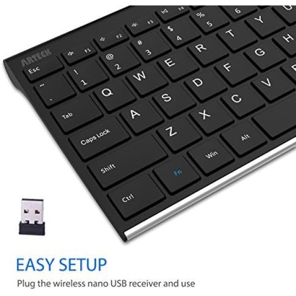 Package contents: Arteck Stainless 2.4G Wireless Keyboard, nano USB receiver, USB charging cable, welcome guide, our 24-month warranty and friendly customer service.