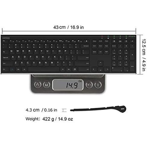 Ultra Thin and Light: Compact size (16.9 X 4.9 X 0.6in) and light weight (14.9oz) but provides full size keys, arrow keys, number pad, shortcuts for comfortable typing.