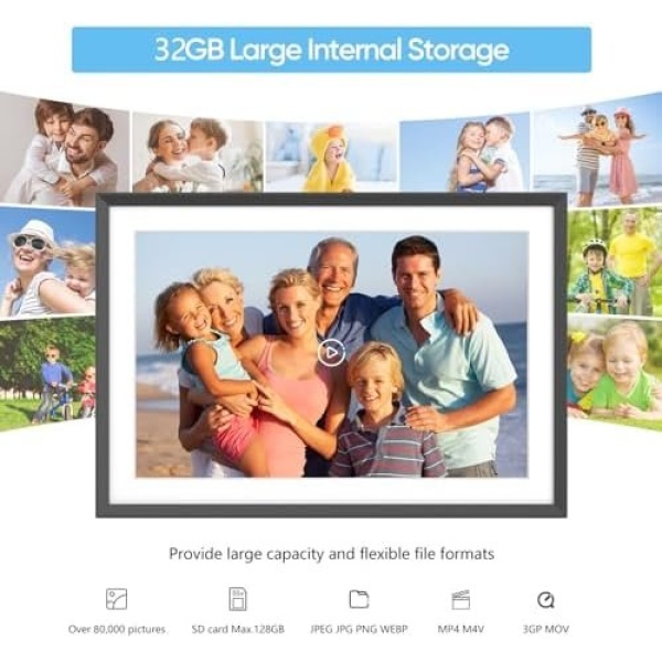 【Wifi Smart Picture Frame】: Connect the electronic picture frame to WiFi network , download the Free FRAMEO app on the phone. then you can privately and safely share photos or videos with family from anywhere and anytime. Built-in 32GB memory and allows to insert SD card(max. 128G, not included), enabling you to read files and export, and back up the received photos and videos for better album management.