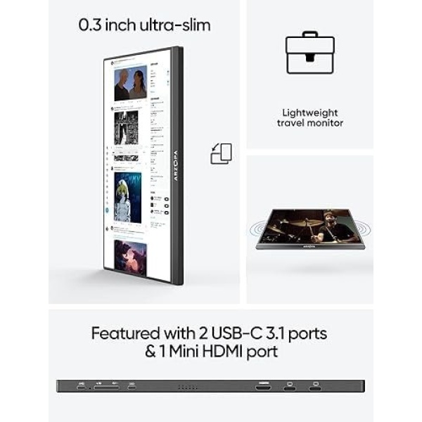 [Lightweight and Portable] Keeping in mind the portability of the monitor, we havecreated a lightweight and easy to carry screen which weighs 1.7lbs and is 0.3-inch slim.Your work gets done efficiently while you are on the trip.