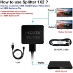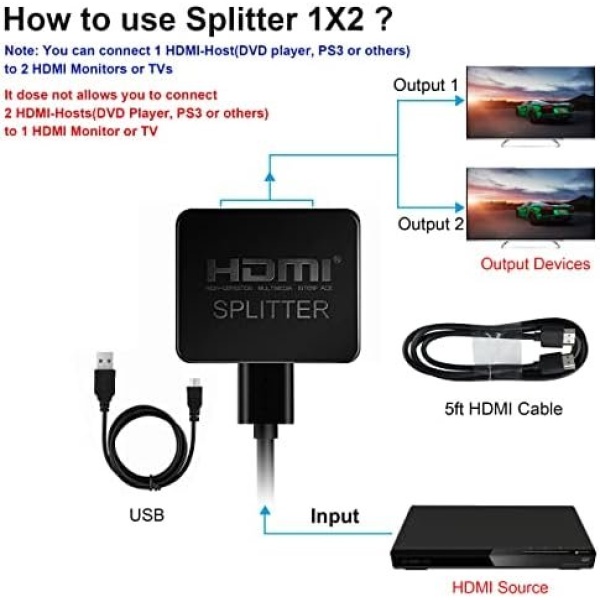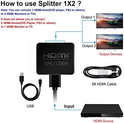PACKAGE INCLUDED – 1 * [ 1 in 2 out HDMI Splitter], 1 * [USB cable(usb power adapter not included,Please plug the usb into a wall outlet,not a cable box etc…)],1*High Speed HDMI Cable