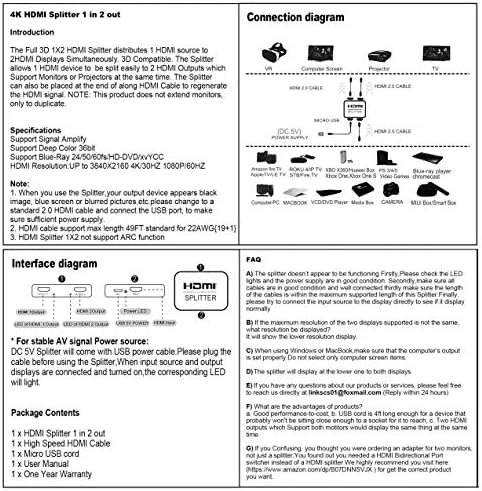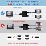 PORTABLE – 4K HDMI Splitter 1 in 2 out, size: 2.5×2.1×0.5 inches/ 6.3X5.3X1.2 cm ( L X W X H ), easy to use and carry, travel friendly. USB cable included(it needs to be powered via usb), no need external driver, safety and Eco-friendly (Seller recommend 25ft long hdmi cable(max))