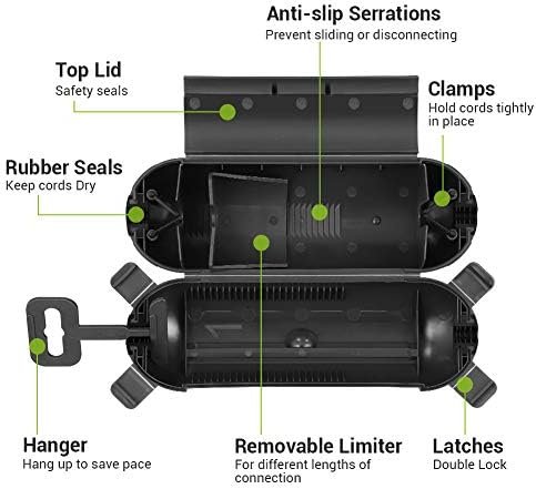 【EASY TO USE】 No tools or installation required; place the extension cord properly; slide the limiter to keep cords securely connected; lock the top lid and 4 latches for seal; hanging to save space; ideal for holiday lights, string lights, pool pumps and garden tools etc