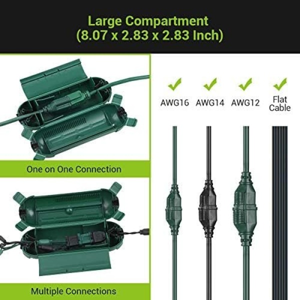 【AMPLE & AJUSTABLE COMPARTMENT】Large housing holds both multiple connections and one on one connection; compatible with AWG 12/14/16 extension cord and flat cable; slide to adjust the position of the limiter for different lengths of connections