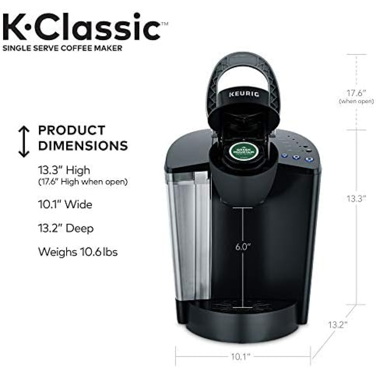 The Classic Keurig K-Cup Single Serve Coffee Maker, and a perennial best-seller, the Keurig K-Classic brews a rich, smooth, and delicious cup every time with the quality you expect from Keurig. Simple touch buttons make your brewing experience stress free, and multiple K-Cup pod brew sizes help to ensure you get your perfect cup. Whether you like your coffee strong, mild, decaf, or flavored, you can brew all of your favorites with the Keurig K-Classic– and with large 48oz water reservoir, you can brew 6+ cups before having to refill. Discover hundreds of K-Cup pod varieties from all of the brands you love, including Green Mountain Coffee, Starbucks, and Lipton, and enjoy coffee, tea, hot cocoa and more. Also available in a two fun colors to complement your décor, and compatible with the Keurig Classic Series My K-Cup Reusable Coffee Filter, so you can brew your own ground coffee.