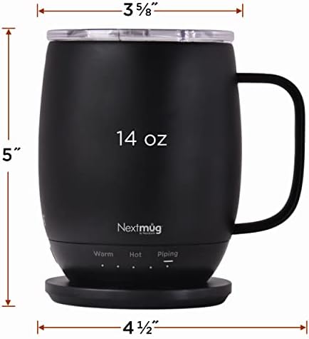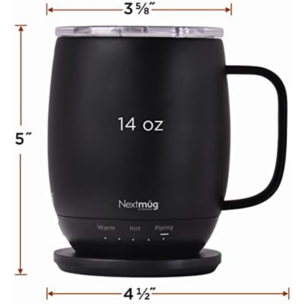 WHAT’S INCLUDED – (1) 14 oz Nextmug; (2) Docking Coaster & 6-foot cord to charge the lithium-ion battery inside the Nextmug; (3) Spill-Resistant Lid to keep hot liquids in the mug and help maintain the ideal temperature for longer periods of time.
