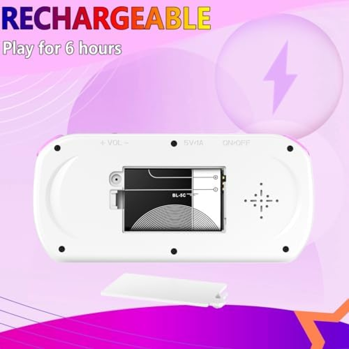 🚀 Rechargeable Battery: The retro video game console has a built-in 1200mAh Li-Ion rechargeable battery, ensuring uninterrupted power source for kids’ games. It is also an environmentally friendly choice as it eliminates the need for frequent battery replacement. When fully charged, the console’s gaming time is approximately 4 to 6 hours, making it ideal for video game play on the go.