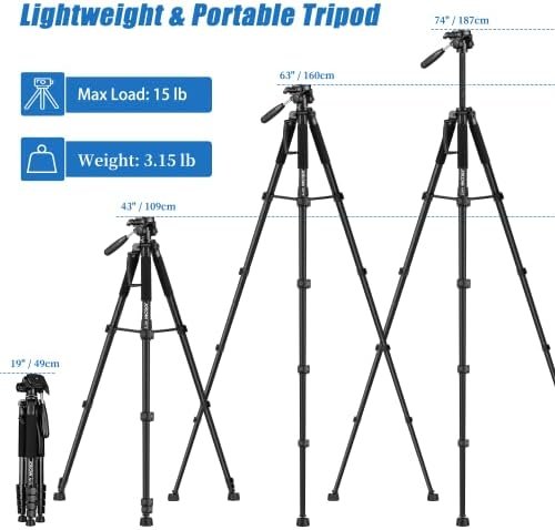 Tripod Camera Tripods, 74″ Tripod for Camera Cell Phone Video Photography