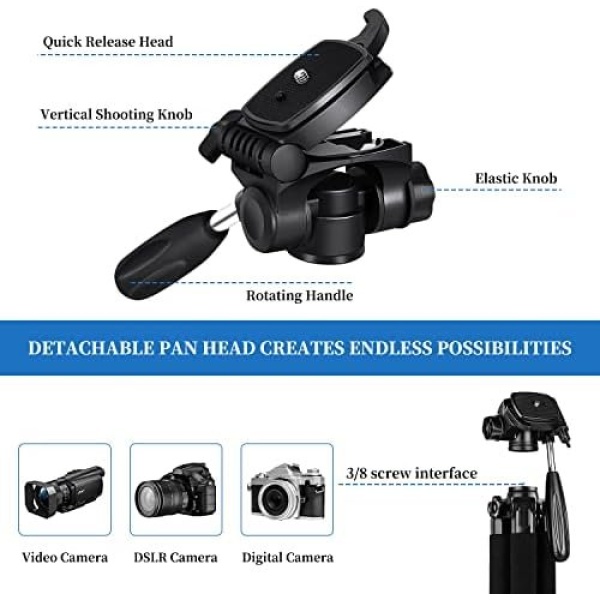 【 3-Way Pan Head 360° Rotation】 JOILCAN compact camera tripod is equipped with a stable smooth ergonomic 3-way pan head: headlock, pan lock, and tilt lock, which can satisfy all the needs of vertical, horizontal, and overhead photography, etc. You can freely adjustable angles for 360° panoramic shooting, 180°up and down shooting, and 90°vertical portrait. When you employ pans and tilts during photo or video recording, the tripod offers superb stability and gives you excellent, smooth results.