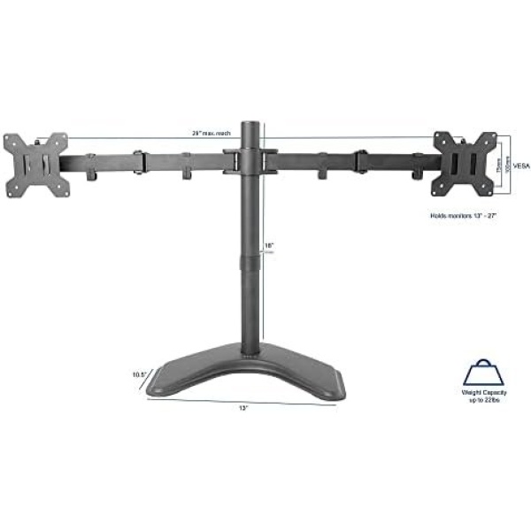 Heavy Duty Base – Measures 13″ x 10.5″ providing solid stability while monitors are held within its center of gravity. The bottom of the base features padding to protect your desk from scratches.