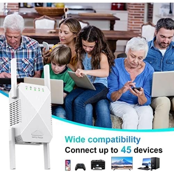 【Highly Compatible with 45 Devices】Easily connect to any brands of router and access points. And The WiFi range extender support up to 45 devices such as smartphones, laptop, xbox/PS, garage doors, IoT and Alexa, IP cameras, Fire Stick TV and any WiFi supporting device.